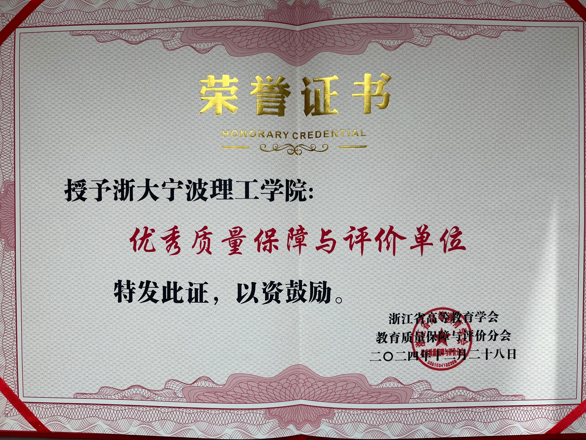 12月28日,浙江省高等教育学会教育质量保障与评价分会2024年年会在丽水举行,会上公布了《关于表彰2024年度浙江省普通高校优秀质量保障与评价单位的通知》,我校被评为“2024年浙江省普通高校优秀质量保障与评价单位”。